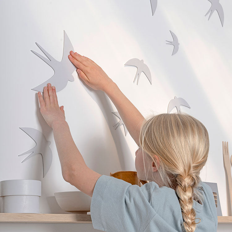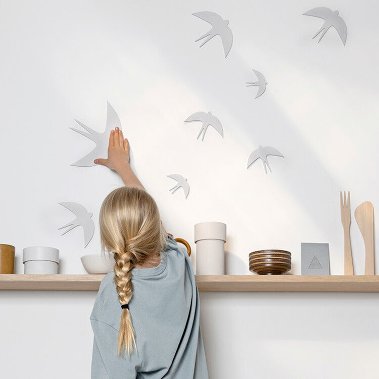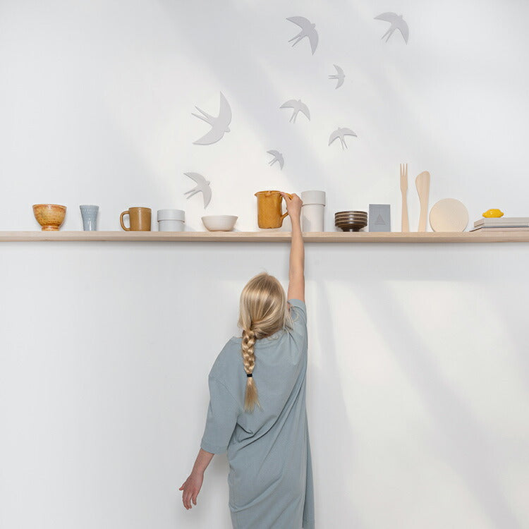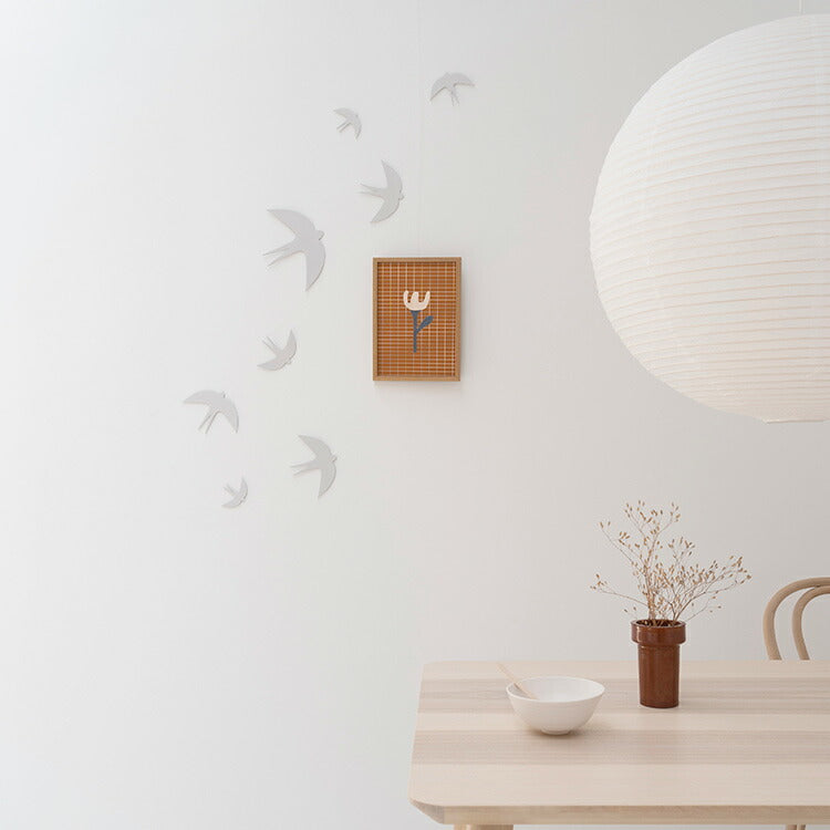 ライトグレーのつばめは、白い壁はもちろん、パステル調のインテリア、アースカラーのお部屋など、どんな場所にも自然に馴染みます。フレームと組み合わせたり、赤ちゃんのお部屋にもおすすめです。