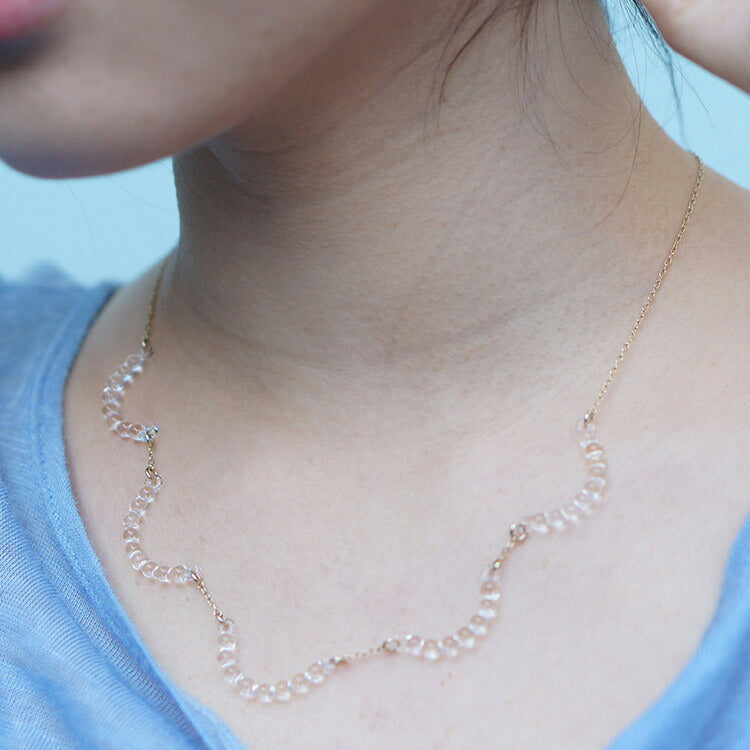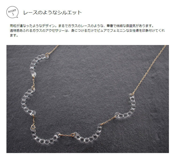 美しく、ピュアに輝くガラスの存在感がさり気なくも、凛とした存在感を放っています。 雨粒が連なったようなデザインで、繊細なガラスが胸元を美しく見せてくれます。
