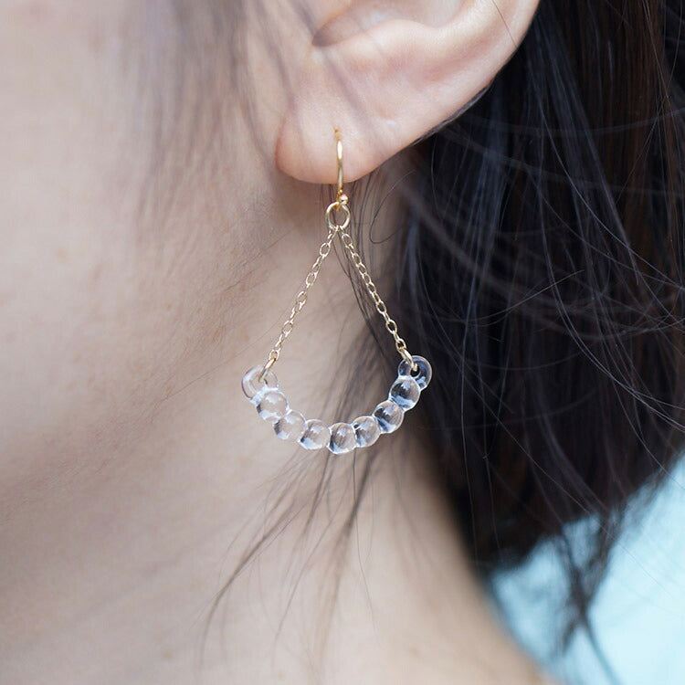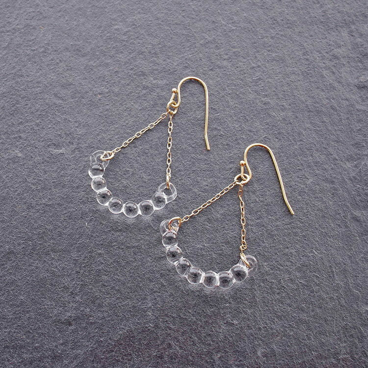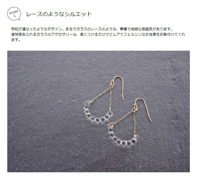 美しく、ピュアに輝くガラスの存在感がさり気なくも、凛とした存在感を放っています。 雨粒が連なったようなデザインで、繊細なガラスが耳元を美しく見せてくれます。