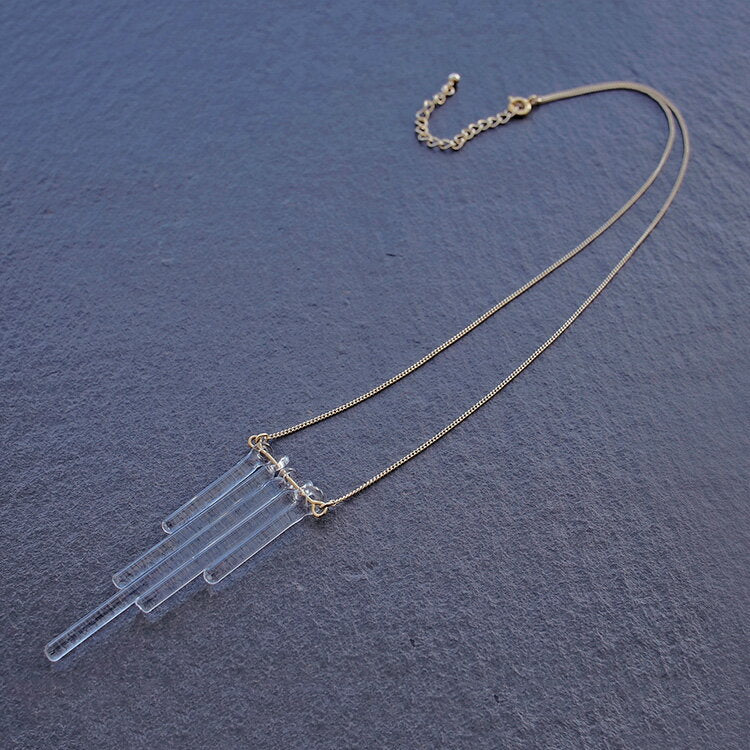 ガラスロッドが胸元で揺れ、光を集めてきらめきます。