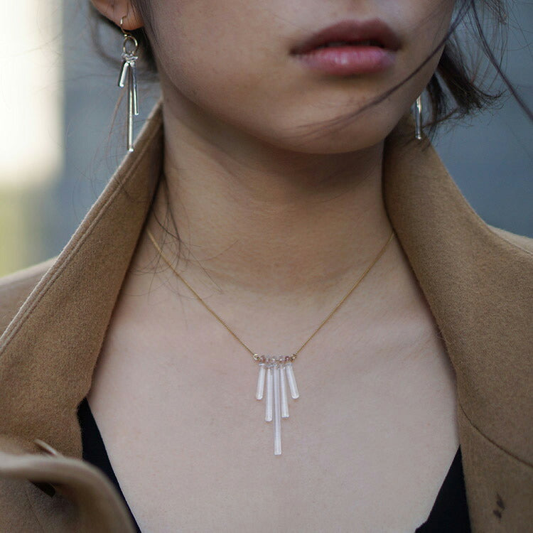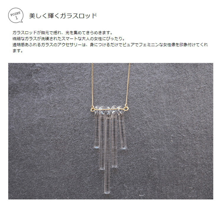 美しく、ピュアに輝くガラスの存在感がさり気なくも、凛とした存在感を放っています。ロッドがきらめきを放ち、繊細なガラスが胸元を美しく見せてくれます。