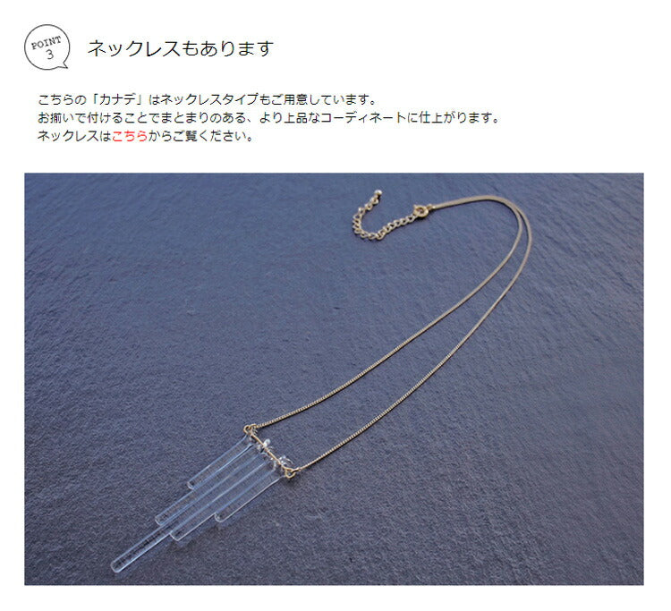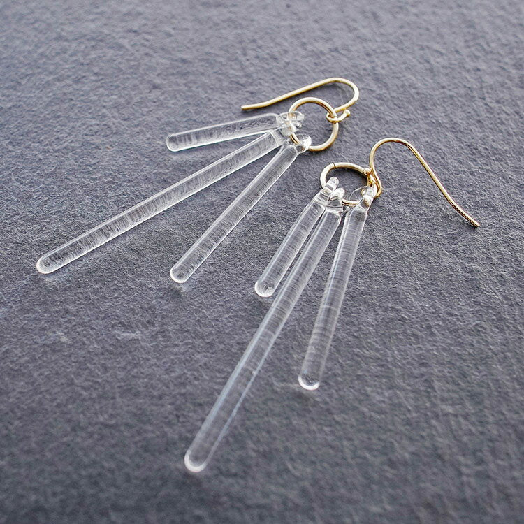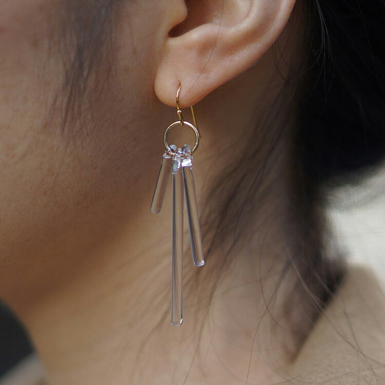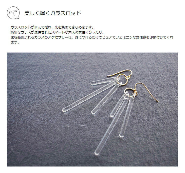 美しく、ピュアに輝くガラスの存在感がさり気なくも、凛とした存在感を放っています。ロッドがきらめきを放ち、繊細なガラスが耳元を美しく見せてくれます。