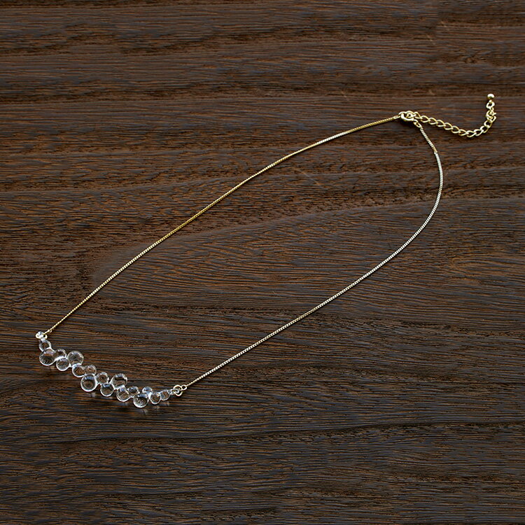 美しく、ピュアに輝くガラスの存在感がさり気なくも、凛とした存在感を放っています。 一粒一粒の水滴が集まってできたようなデザインで、繊細なガラスが胸元を美しく見せてくれます。
