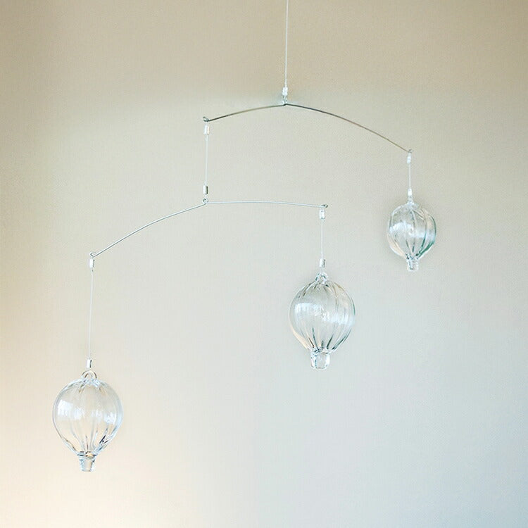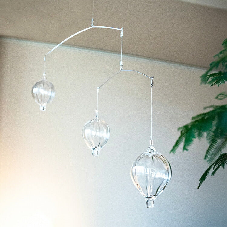 HARIOのガラス職人がバーナーワークで手づくりしたパーツを、mother toolの職人さんが組み立てして作ったガラスのモビール。