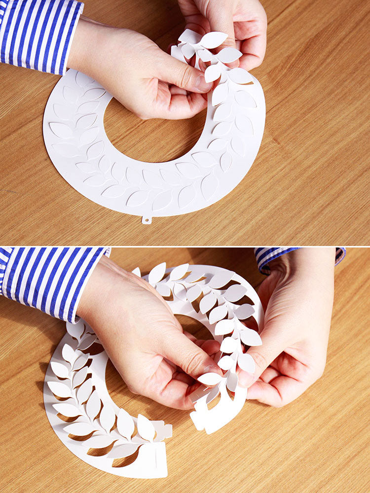 作り方4:リースが山型のドーナツ状に組み立てられれば出来上がりです。上部に引っ掛ける穴が開いていますので、画鋲で固定したり、フックに引っ掛けたり、紐で吊るしたりすることができます。壁に穴が開けれれない方はマスキングテープで留めるのもお勧めです。