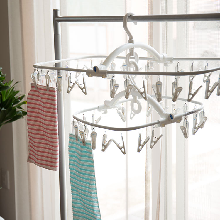 32Pの洗濯ハンガーから下に吊り下げて使うことが可能です。 これで狭い場所でも一度に沢山の洗濯物を干すことができます。