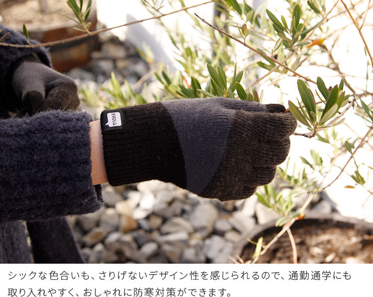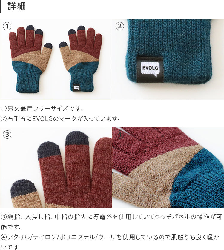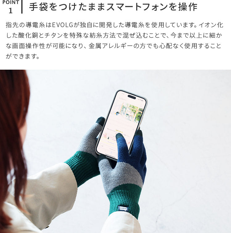 指先の導電糸はEVOLGが独自に開発した導電糸を使用しています。 イオン化した酸化銅とチタンを特殊な紡糸方法で混ぜ込むことで、今まで以上に細かな画面操作性が可能になり、金属アレルギーの方も心配なく使用することができます。