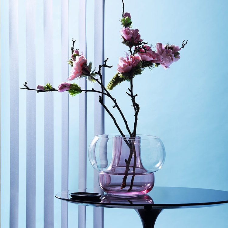 2色のベースからできており、プラムのベースには花や枝物を、クリアのベースには花弁や小石、多肉植物を。