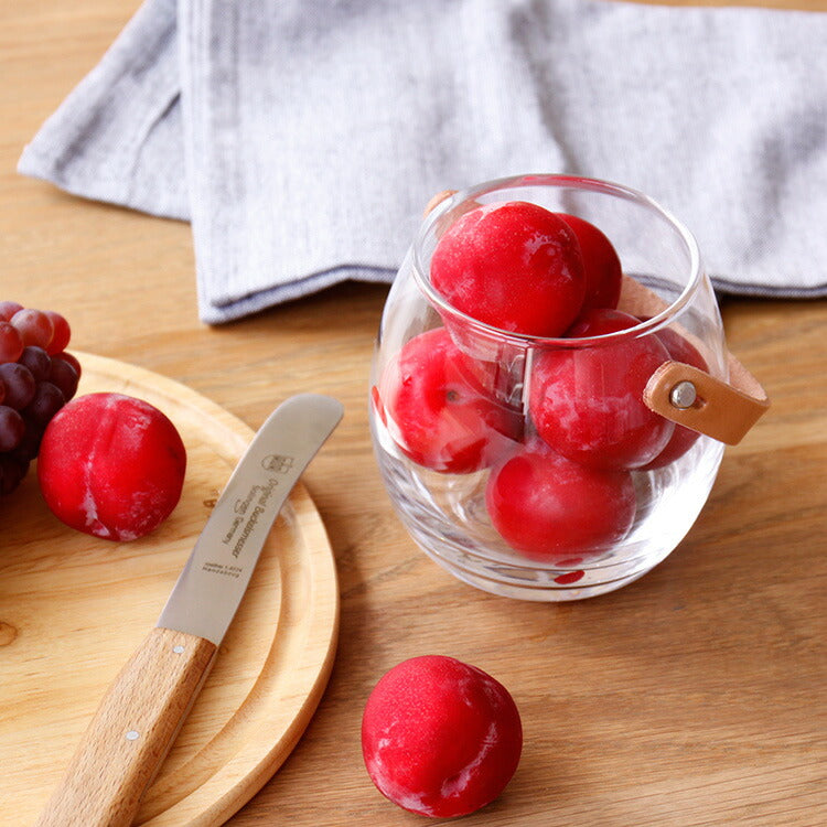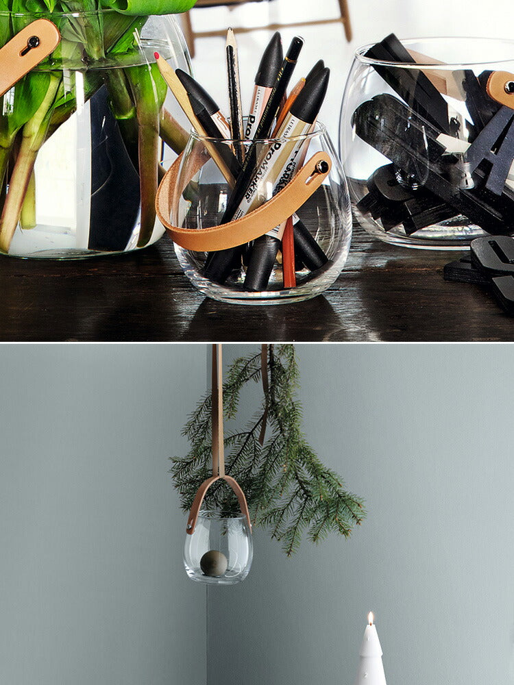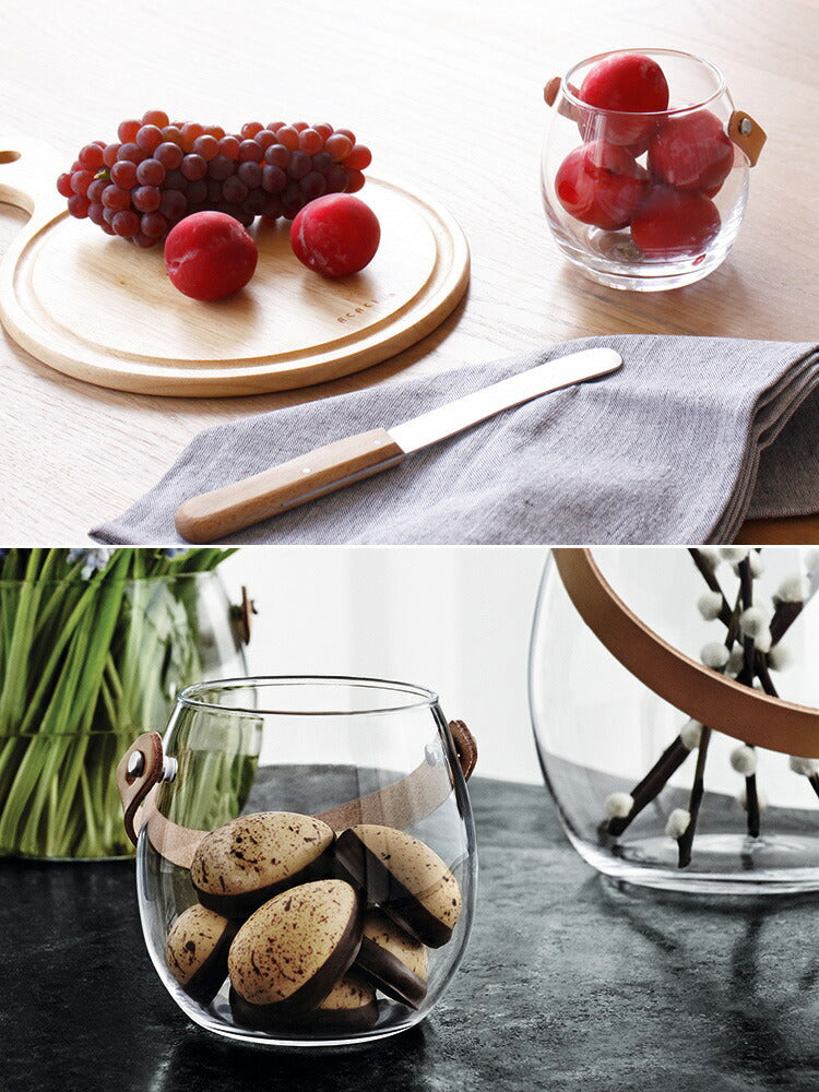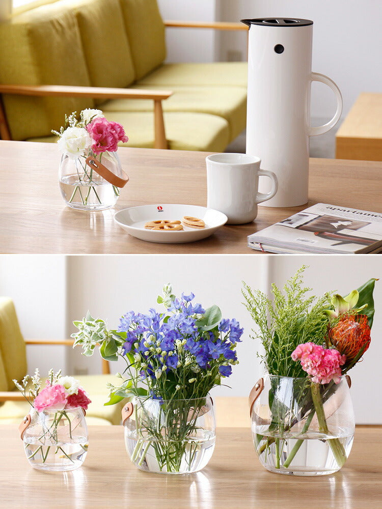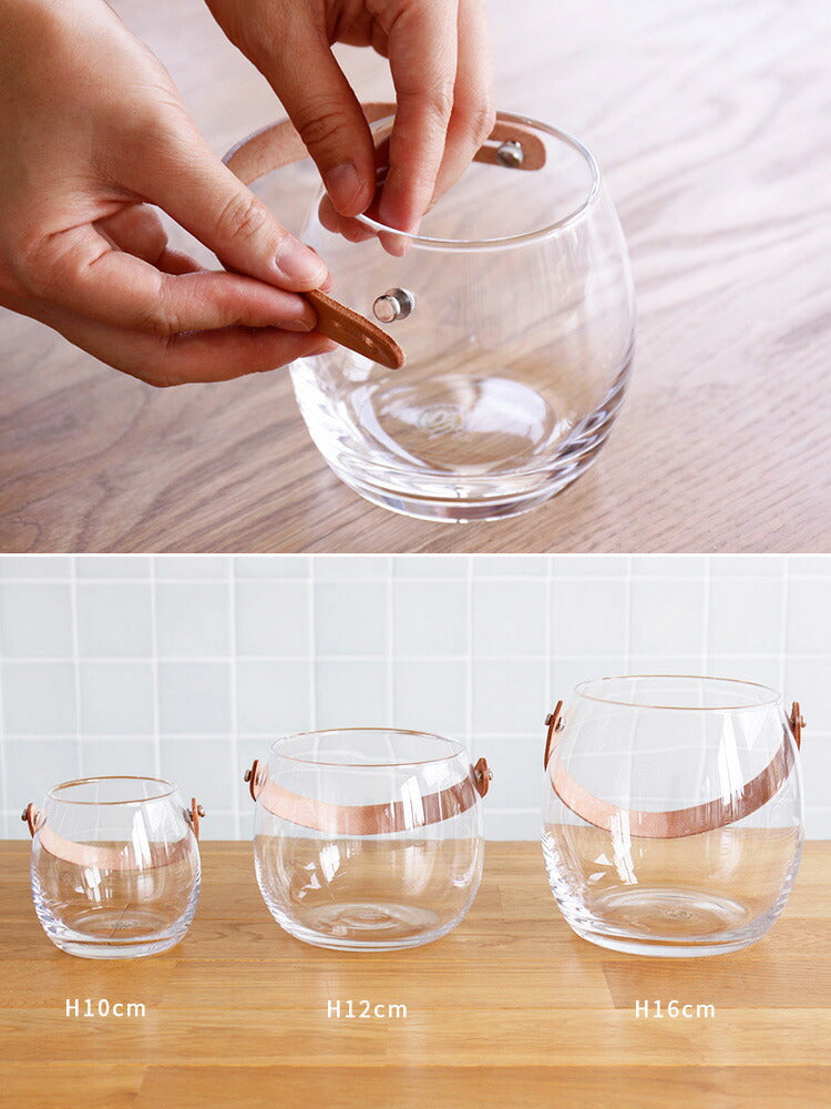 革のストラップがおしゃれなガラスポットは、アイディア次第で様々な用途にお使いいただけます。