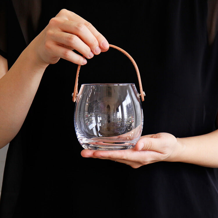丸みのあるガラスのフォルムはインテリアにやわらかい印象を与え、まるでオブジェのような存在感があります。革のストラップはデザインの良いアクセントになっていて、持ち運びの際にも便利です。