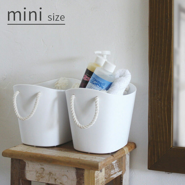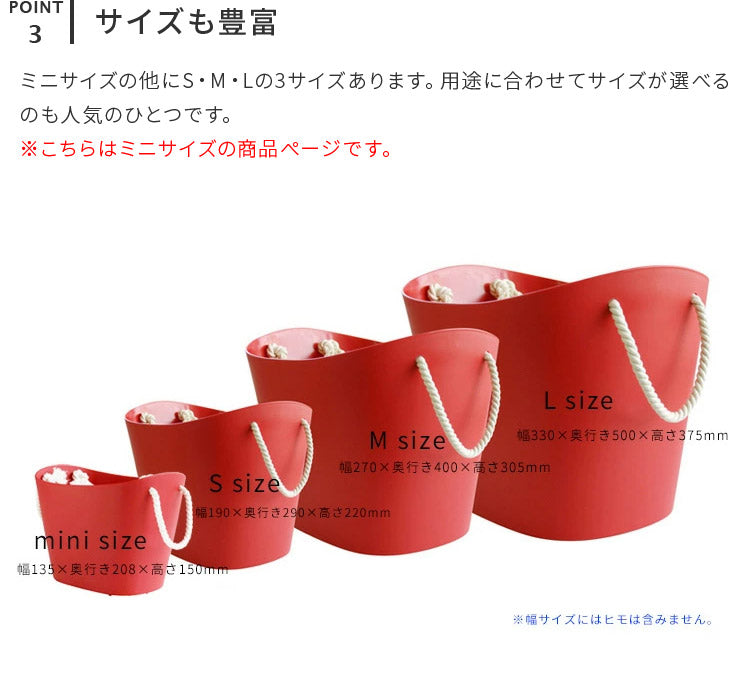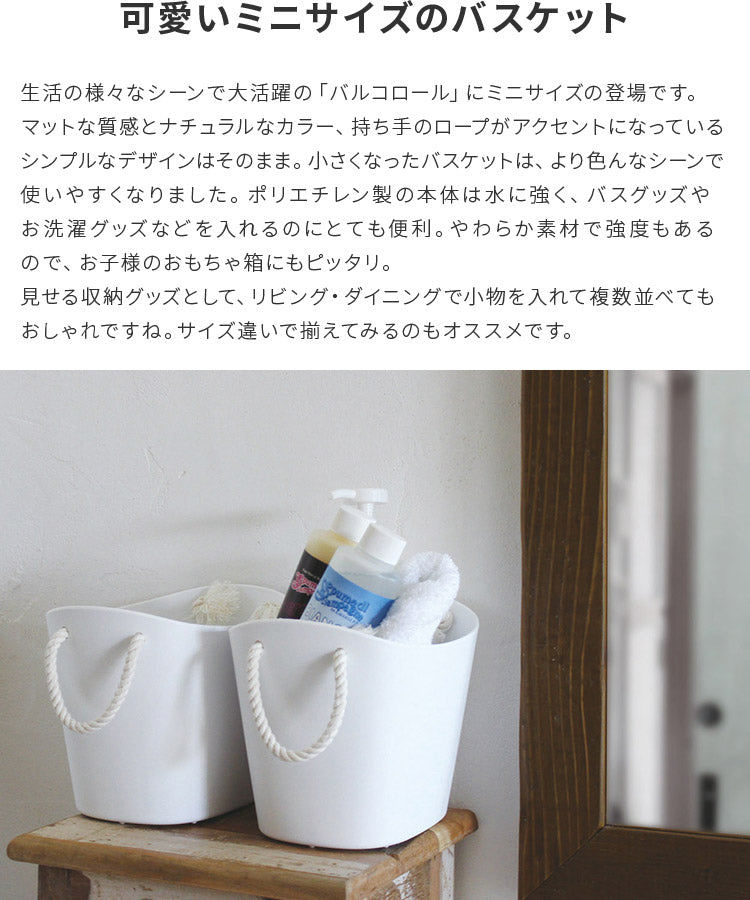 生活の様々なシーンで大活躍の「バルコロール」にミニサイズの登場です。マットな質感とナチュラルなカラー、持ち手のロープがアクセントになっているシンプルなデザインはそのまま。小さくなったバスケットは、より色んなシーンで使いやすくなりました。ポリエチレン製の本体は水に強く、バスグッズやお洗濯グッズなどを入れるのにとても便利。やわらか素材で強度もあるので、お子様のおもちゃ箱にもピッタリ。見せる収納グッズとして、リビング・ダイニングで小物を入れて複数並べてもおしゃれですね。サイズ違いで揃えてみるのもオススメです。