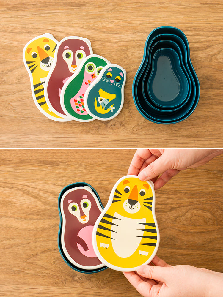 使わない時はマトリョーシカのように一番大きなコンテナに全て収めて収納できます。収納の時までかわいいデザインです。お弁当として持ち運ぶ際にも、食べ終わったあとにコンパクトに重ねられるので、とっても便利です。