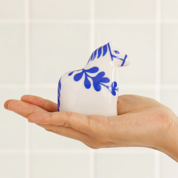 ブルーの化粧箱に詰めてお届けします。箱には、ダーラナのうまのイラストとリサ・ラーソンのサインが上品な銀の箔押しで描かれています。